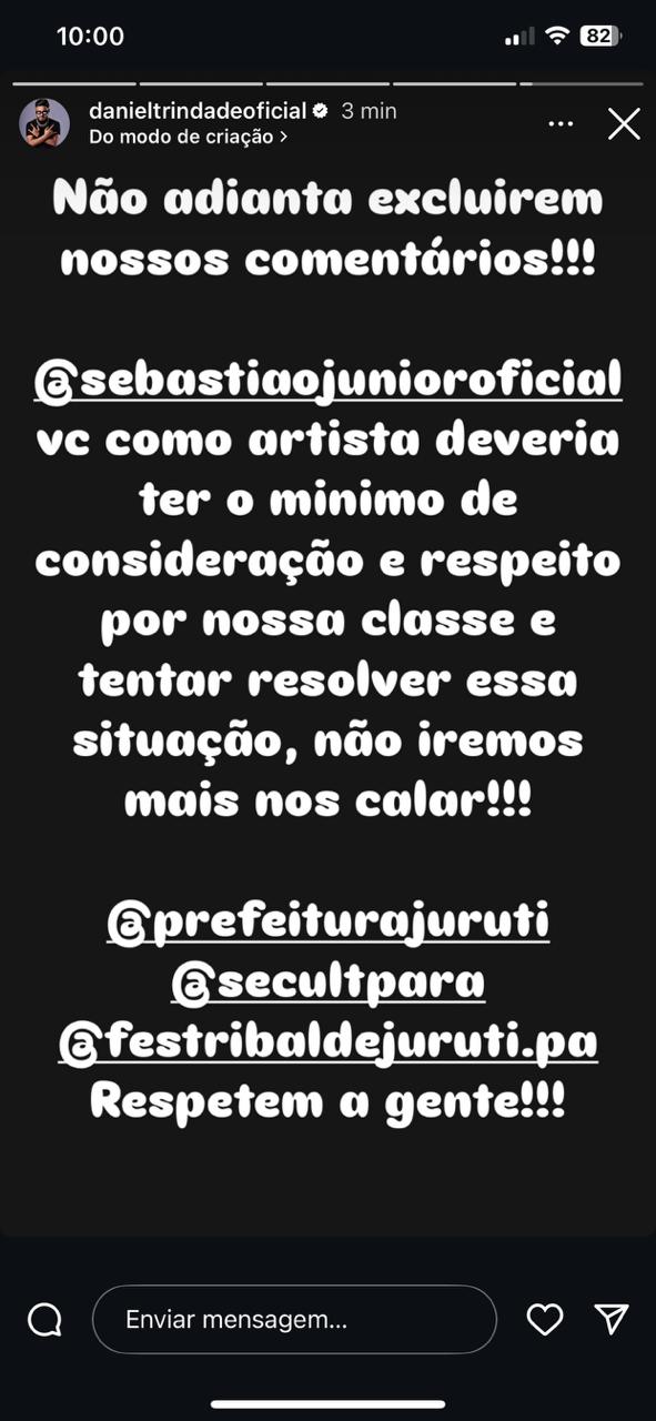 Daniel também afirmou que Sebastião sequer responde suas mensagens ou dá qualquer satisfação. “Você como artista deveria ter o mínimo de consideração e respeito por nossa classe”, desabafou o cantor, criticando a postura do ex-levantador de toadas do Garantido.