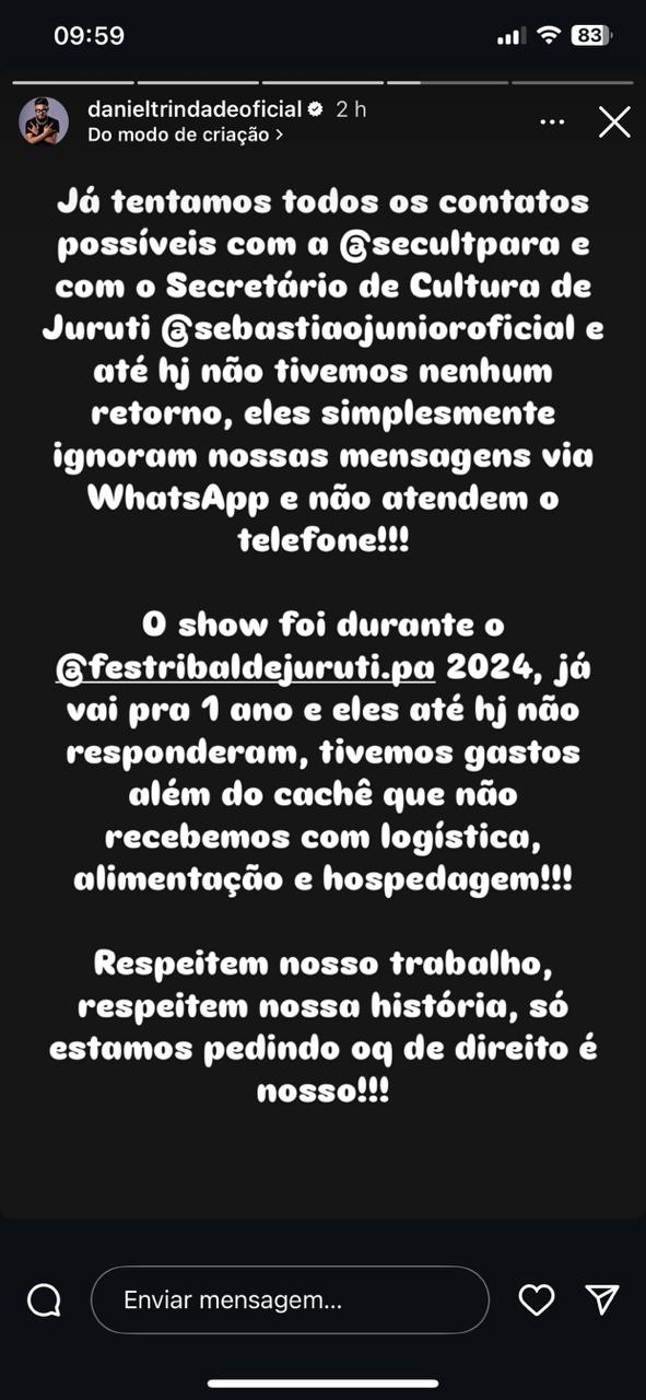 Por meio dos stories, Daniel relatou que foi contratado para se apresentar no Festribal, evento que acontece anualmente durante três dias. Segundo o cantor, os custos com hospedagem, alimentação e passagens, tanto dele quanto de sua equipe, foram pagos do próprio bolso. Ele aguardava o pagamento pelo serviço, mas, quase um ano depois, ainda não recebeu o valor devido.