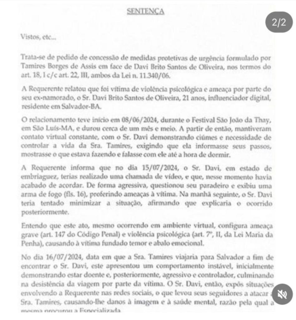 De acordo com a sentença, o pedido foi proferido pela Delegacia da Mulher, para garantir a segurança da influenciadora.