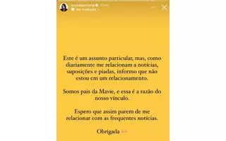 “Este é um assunto particular, mas, como diariamente me relacionam à notícias, suposições e piadas, informo que não estou em um relacionamento. Somos pais da Mavie, e essa é a razão do nosso vínculo. Espero que assim parem de me relacionar com as frequentes notícias. Obrigada”, escreveu ela.
