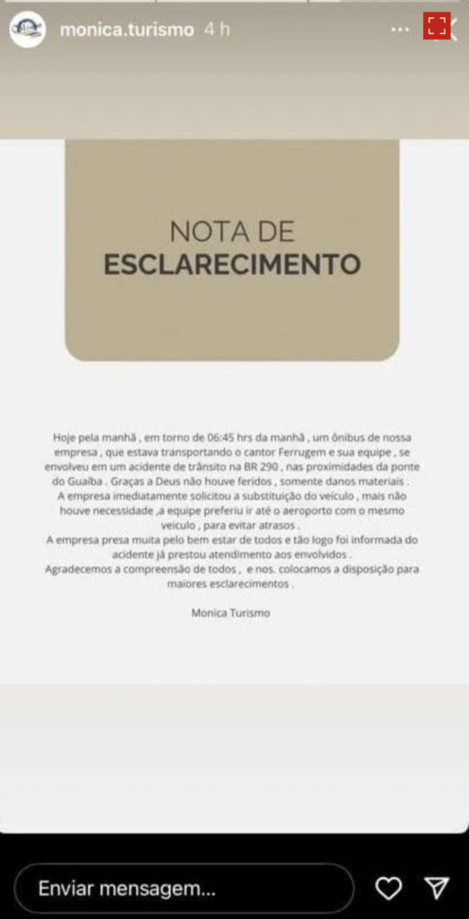 “Hoje pela manhã, em torno de 6h45 da manhã, um ônibus de nossa empresa, que estava transportando o cantor Ferrugem e sua equipe, se envolveu em um acidente de trânsito na BR 290, nas proximidades da ponte do Guaíba. Não houve feridos, somente danos materiais. A empresa imediatamente solicitou a substituição do veículo, mas não houve necessidade, a equipe preferiu ir até o aeroporto com o mesmo veículo para evitar atrasos”, consta no comunicado.