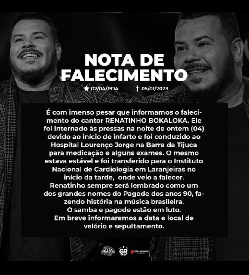 “É com imenso pesar que informamos o falecimento do cantor Renatinho Bokaloka. Ele foi internado às pressas na noite de ontem (04) devido ao início de infarto e foi conduzido ao Hospital Lourenço Jorge na Barra da Tijuca para medicação e alguns exames. O mesmo estava estável e foi transferido para o Instituto Nacional de Cardiologia em Laranjeiras no início da tarde, onde veio a falecer. Renatinho sempre será lembrado como um dos grandes nomes do Pagode dos anos 90, fazendo história na música brasileira. O samba e pagode está em luto. Em breve informaremos a data e local de velório e sepultamento”, diz o comunicado enviado por sua equipe.