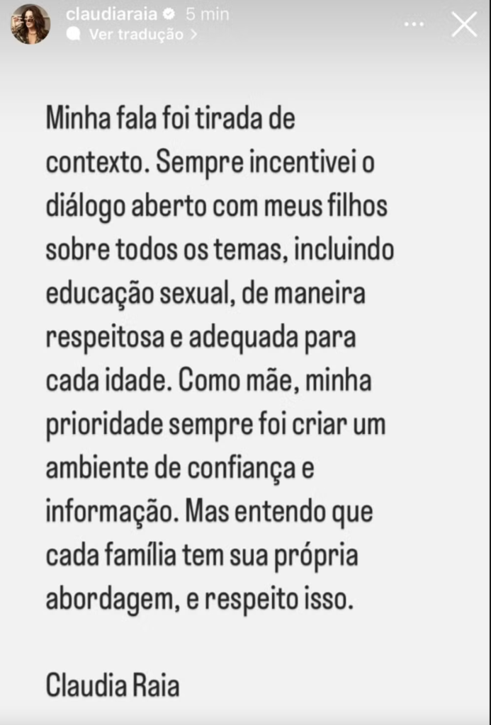 “Minha fala foi tirada de contexto. Sempre incentivei o diálogo aberto com meus filhos sobre todos os assuntos, incluindo educação sexual, de forma respeitosa e apropriada para cada idade. Como mãe, minha prioridade sempre foi criar um ambiente de confiança e informação. No entanto, entendo que cada família tem sua própria forma de lidar com esses temas, e respeito isso”, escreveu Claudia Raia.
