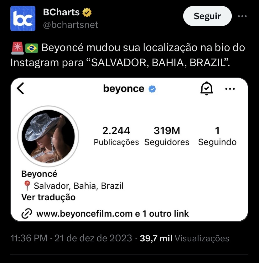 A cantora ainda levou os fãs brasileiros a loucura ao colocar na Bio do próprio Instagram a localização de ‘Salvador – Bahia – Brazil’.