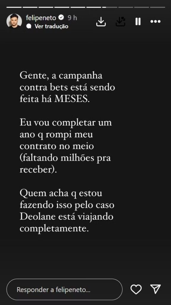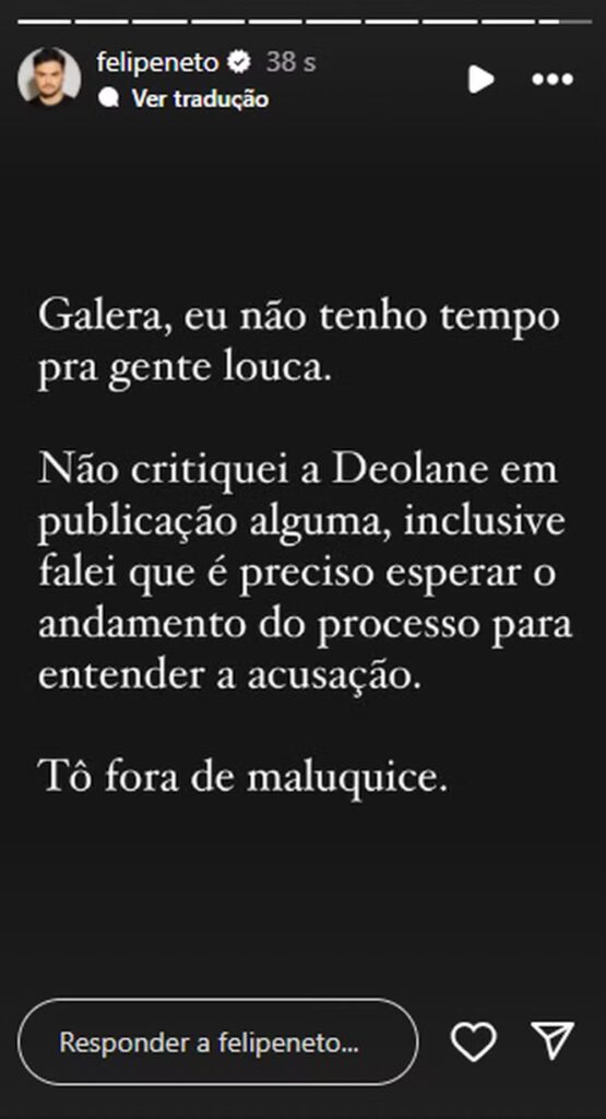 Felipe Neto, por sua vez, se defendeu em seus Stories, afirmando que não criticou Deolane em sua publicação e que apenas destacou a necessidade de aguardar o andamento do processo. “Galera, eu não tenho tempo pra gente louca. Não critiquei a Deolane em publicação alguma, inclusive falei que é preciso esperar o andamento do processo”, disse ele, reafirmando que não está envolvido na polêmica.