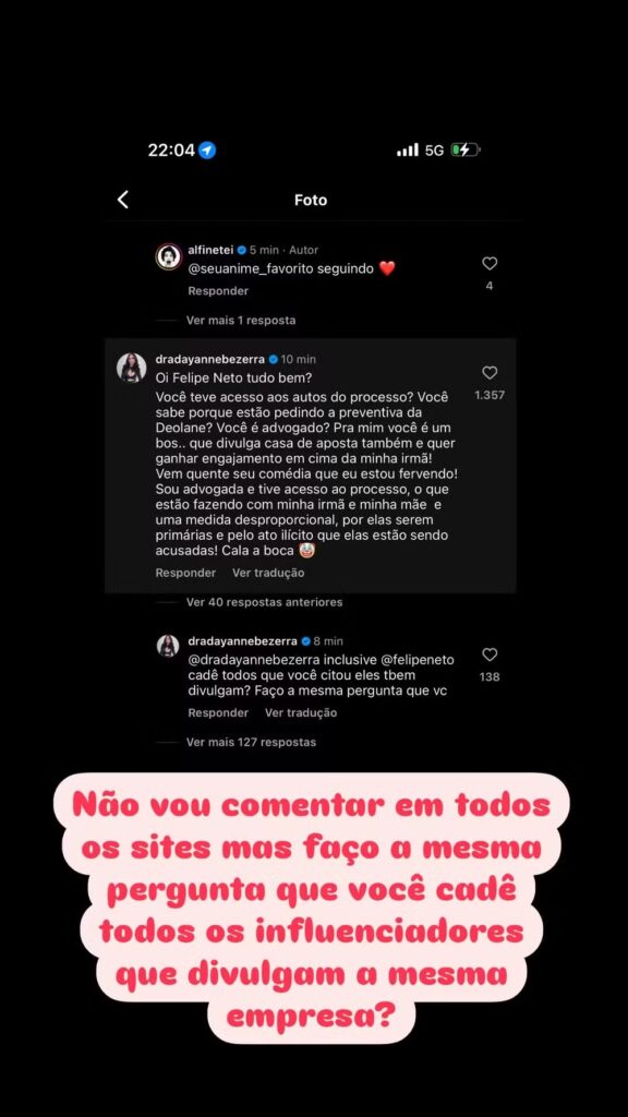 Brasil – Nesta quinta-feira (5), Dayanne Bezerra, irmã de Deolane Bezerra, expressou sua revolta nas redes sociais contra o youtuber Felipe Neto, após ele comentar sobre a prisão de Deolane. A influenciadora e advogada não poupou críticas e afirmou que vai processar o influenciador, chamando-o de “comediante” e insinuando que ele também promove casas de apostas, assim como sua irmã.