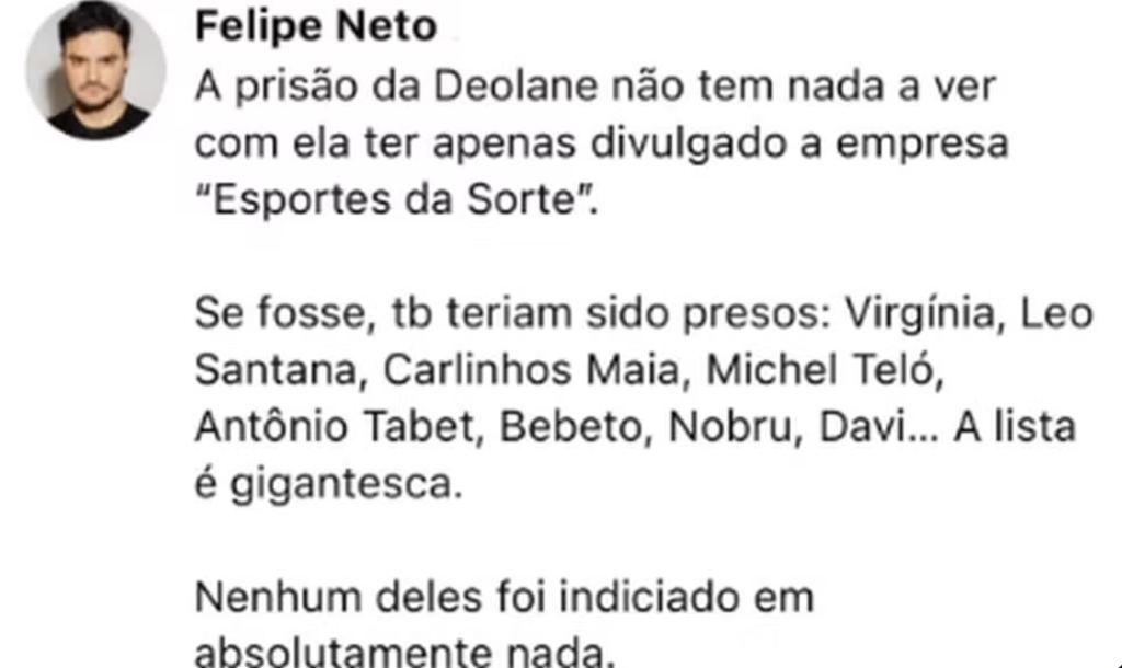 A polêmica começou quando Felipe Neto fez uma publicação dizendo que a prisão de Deolane não estava relacionada apenas à divulgação da empresa “Esportes da Sorte”, mencionando outros influenciadores que também promovem a mesma marca e não foram indiciados. “A prisão da Deolane não tem nada a ver com ela ter apenas divulgado a empresa. Se fosse assim, muitos outros influenciadores também estariam presos”, declarou Felipe.