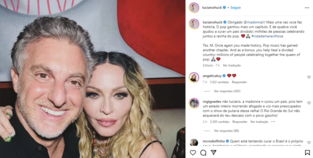 Brasil – O show de Madonna na Praia de Copacabana, no Rio de Janeiro, neste sábado (4), tornou-se palco não apenas de música e entretenimento, mas também de polêmicas e desconexão com a realidade brasileira. Contudo, o que chamou ainda mais atenção foi a postura do apresentador Luciano Huck, que pareceu distante dos problemas reais do país ao exaltar o evento como uma suposta cura para uma nação dividida.