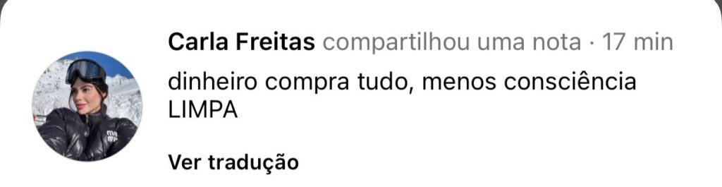 Minutos após o resultado vir a público, Carla Freitas se manifestou em suas redes sociais. Em uma publicação curta, mas carregada de emoção, ela escreveu: “Dinheiro compra tudo, menos consciência limpa”.