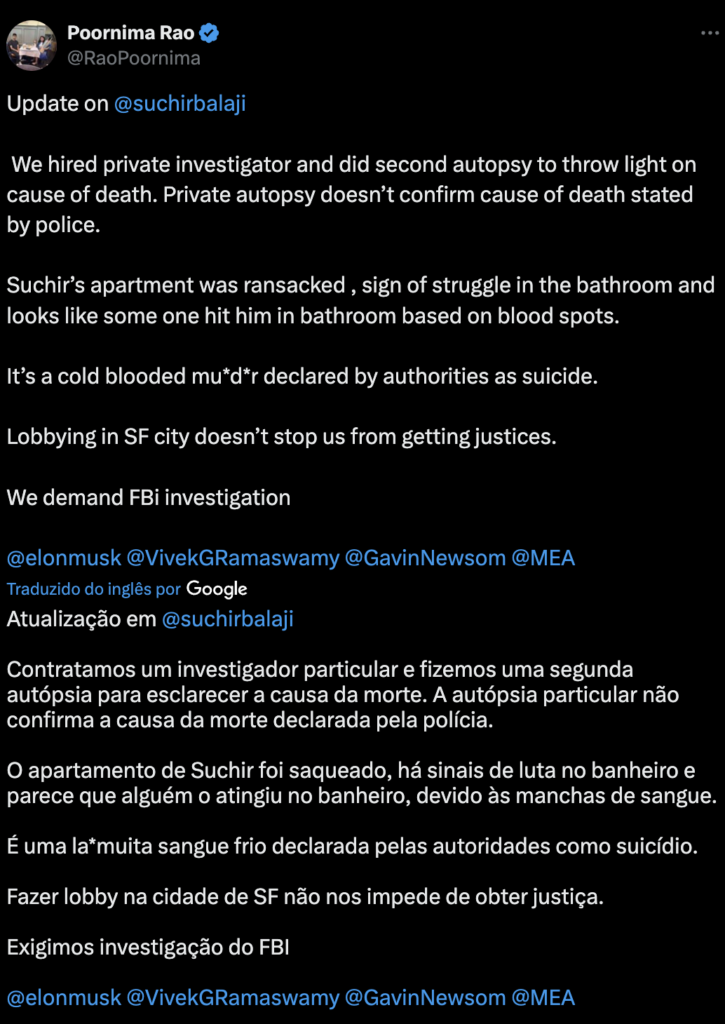 Poornima tem usado as redes sociais para expor sua crença de que houve um crime. Ela revelou que uma autópsia independente contradisse as conclusões da autópsia oficial. “A autópsia privada não confirma a causa de morte declarada pela polícia”, escreveu. Poornima também destacou sinais de luta no apartamento de Balaji, incluindo manchas de sangue no banheiro. “O apartamento do Suchir foi revirado. Há sinais claros de luta no banheiro e parece que alguém o atacou ali”, afirmou, classificando o ocorrido como “um assassinato a sangue frio”.