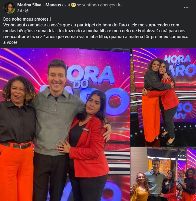 Brasil – Em uma emocionante participação no programa “A Hora do Faro”, a vida de Maria Solange Paulino Amorim, conhecida como “Marina Silva de Manaus”, deu uma reviravolta. Ela foi surpreendida por Rodrigo Faro, que trouxe sua filha e neto, que estavam há 22 anos longe dela, vindo diretamente de Fortaleza, Ceará.