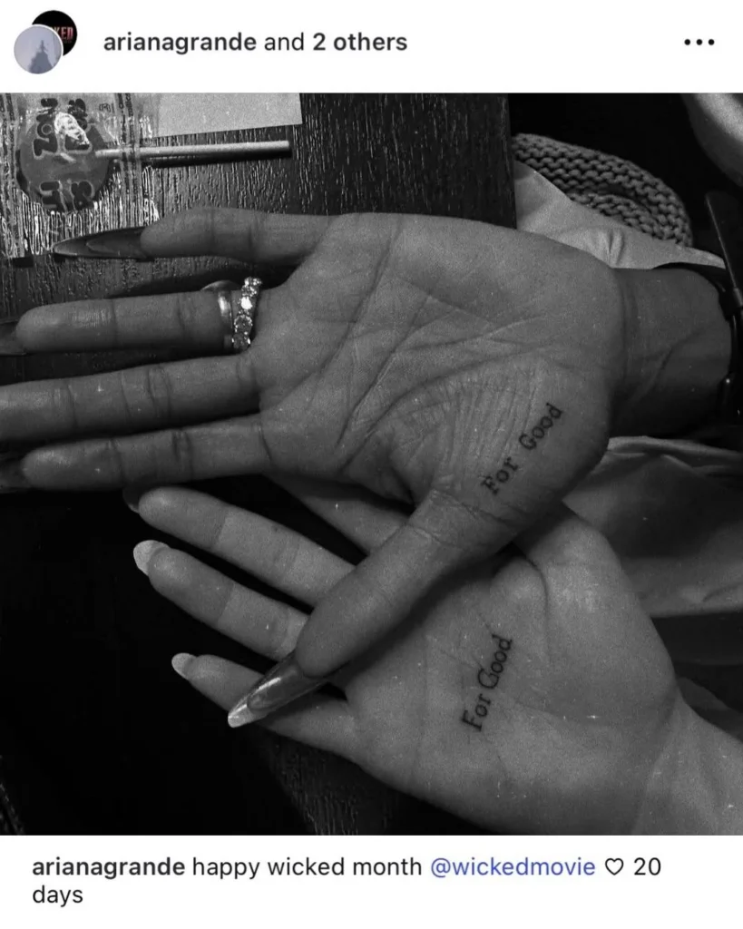 Outro ponto polêmico é o das tatuagens matching: as duas revelaram publicamente várias tatuagens idênticas em homenagem ao filme, como “For Good” nas palmas das mãos (posicionadas para se tocarem ao dar as mãos), flores de papoula nas laterais e corações com iniciais trocadas (“E” para Elphaba/Erivo no de Ariana e “G” para Glinda/Grande no de Cynthia), o que para muitos fãs reforça a narrativa de um vínculo obsessivo e codependente, com especulações de que seriam “selos de pacto” ou símbolos de controle emocional.