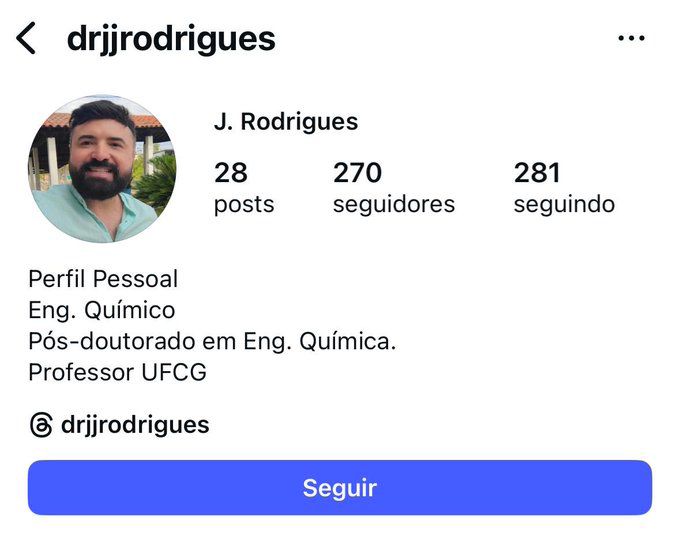 O rapaz se chama J.Rodrigues. Em sua bio do Instagram, ele se identifica como engenheiro químico, professor da Universidade Federal de Campina Grande (UFCG) e tem Pós-Douturado em Engenharia Química.