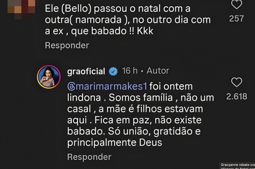 A publicação gerou repercussão imediata, com muitos elogios à postura madura do ex-casal, mas também comentários maliciosos. Uma internauta ironizou: “Ele (Belo) passou o Natal com a outra (namorada), no outro dia com a ex. Que babado (risos)”. Gracyanne não deixou passar e rebateu com classe: “Foi ontem (véspera de Natal), lindona. Somos família, não um casal. A mãe e filhos [do Belo] estavam aqui. Fica em paz, não existe babado. Só união, gratidão e, principalmente, Deus”.