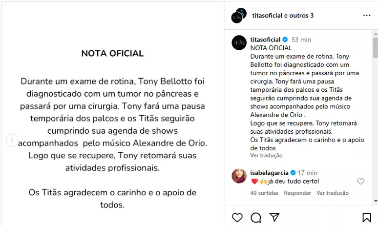 Na legenda, os Titãs reforçou o comunicado e agradeceu o carinho e o apoio de todos. Famosos e músicos do meio desejaram melhoras à Tony. “Vamos estar esperando você de volta nos palcos”, escreveu PJ, do Jota Quest.