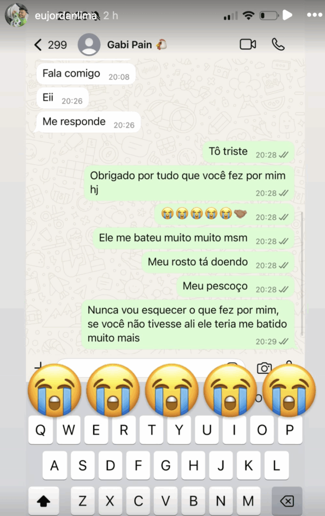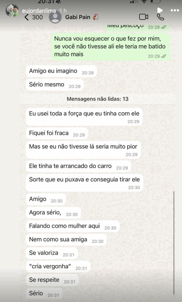 No vídeo, publicado em seus Stories no Instagram, Jordan Lima aparece visivelmente abalado, chorando e mostrando as marcas da agressão. “Eu só te fiz o bem, e olha o que tu fez. Todo bem que eu te fiz, tu me devolveu em porrada”, disse, dirigindo-se ao ex-parceiro. Ele relatou que o agressor tentou quebrar a porta de seu carro e deu um tapa no veículo, quase quebrando o vidro. “As peças do meu carro são caras. Se não fosse minha amiga, tu tinha me batido muito mais”, afirmou, destacando a intervenção de uma amiga que o consolava ao fundo.
