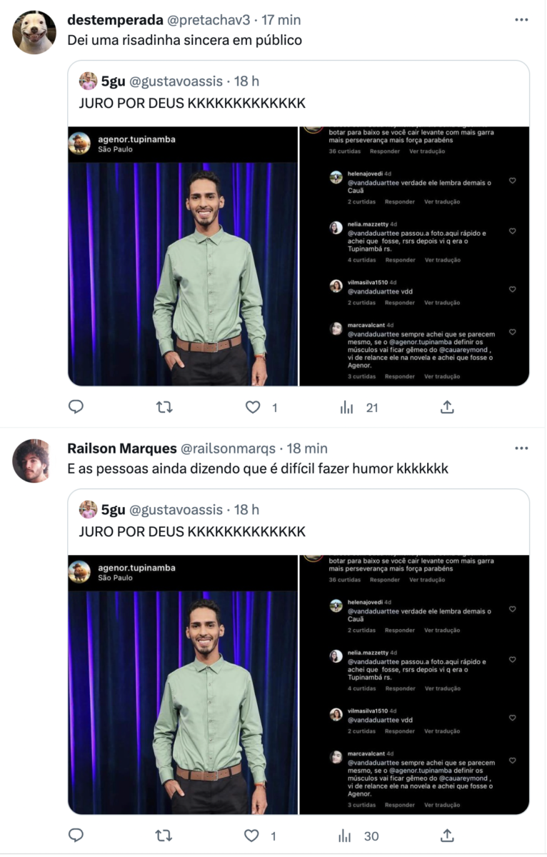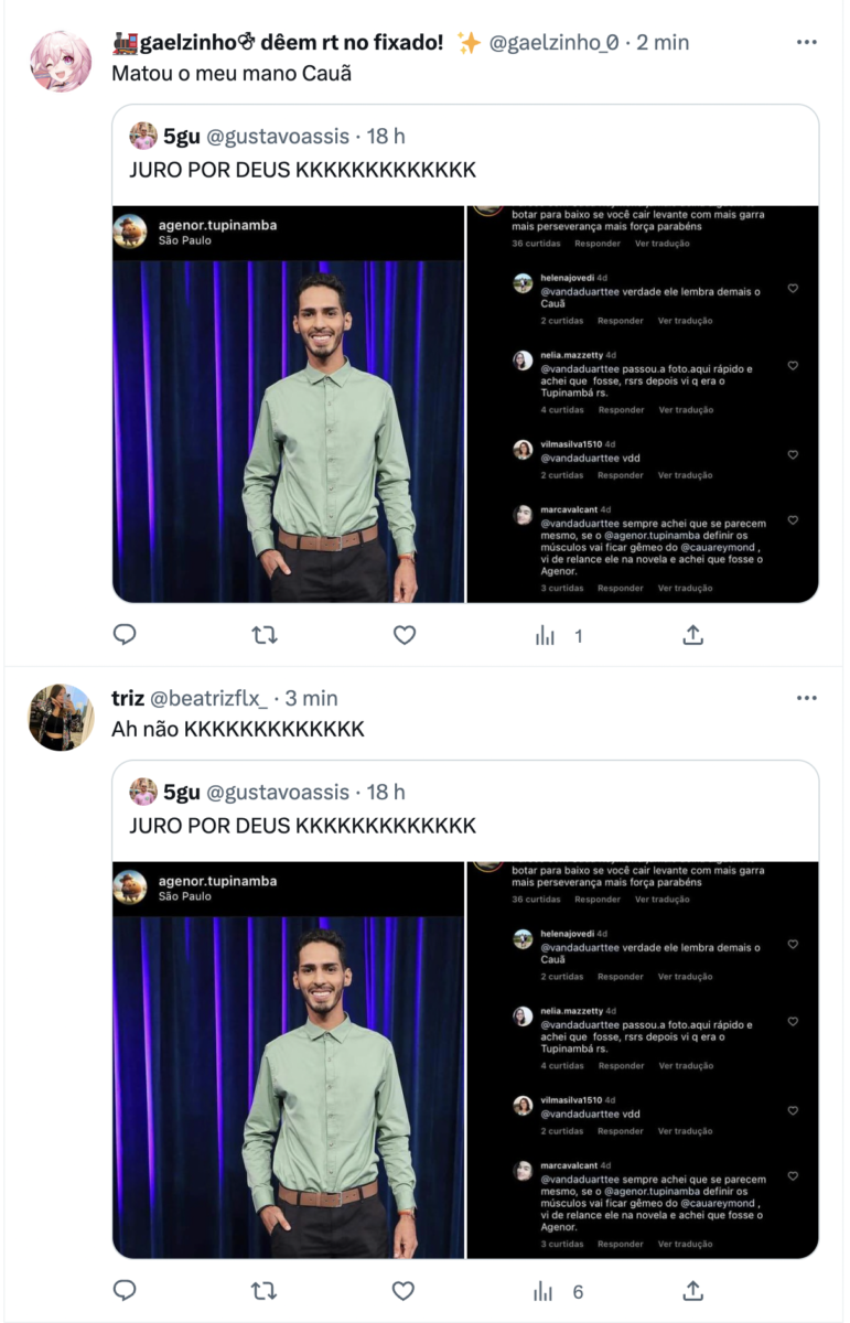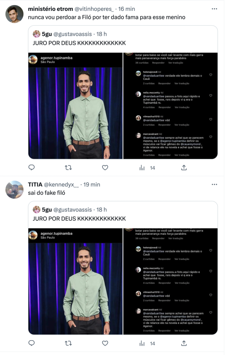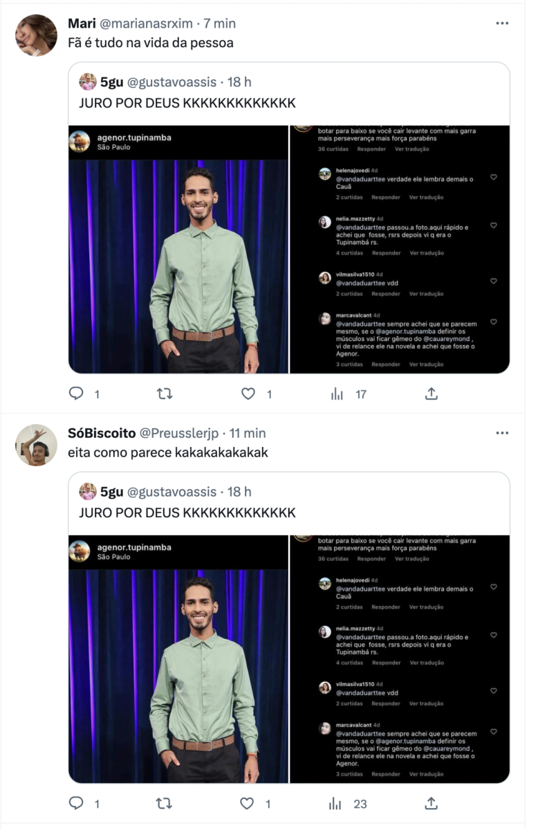 Rapidamente este comentário recebeu inúmeras respostas de outras fãs concordando que Agenor parece com o ator.