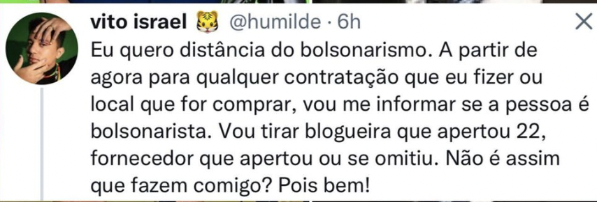 “Eu quero distância do bolsonarismo. A partir de agora para qualquer contratação que eu fizer ou local que for comprar, vou me informar se a pessoa é bolsonarista. Vou tirar blogueira que apertou 22, fornecedor que apertou ou se omitiu. Não é assim que fazem comigo? Pois bem!”, escreveu o publicitário.