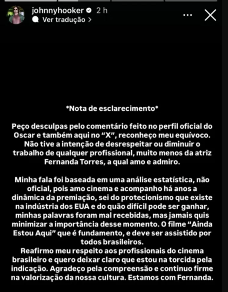 – “Peço desculpas pelo comentário feito no perfil oficial do Oscar e também aqui no X. Reconheço meu equívoco. Não tive a intenção de desrespeitar ou diminuir o trabalho de qualquer profissional, muito menos da atriz Fernanda Torres, a qual amo e admiro”, declarou ele em seus stories no Instagram.