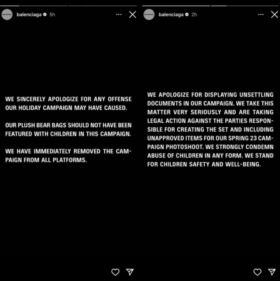A grife também comentou a inserção de documentos judiciais no meio da campanha. “Nós pedimos desculpas por mostrar documentos perturbadores na nossa campanha. Nós levamos esse assunto muito a sério e estamos tomando ações legais contra as partes responsáveis por criar o set e incluir itens não aprovados para o ensaio fotográfico da nossa campanha primavera 23. Nós condenamos vigorosamente o abuso de crianças de qualquer forma. Nós defendemos a segurança e o bem-estar das crianças”, concluiu.
