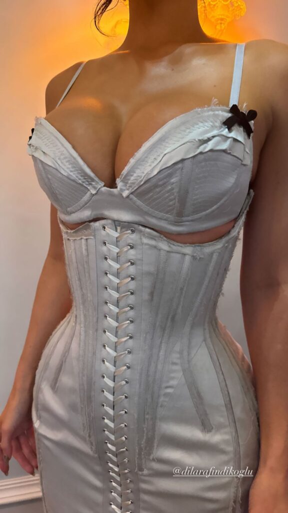A peça, assinada pela designer turca Dilara Findikoglu, é elegante e bem estruturada, com corset marcado, alças finas e saia justa ao corpo. No entanto, o tom pálido do tecido levantou uma velha discussão sobre regras de etiqueta em casamentos: convidado pode usar branco?