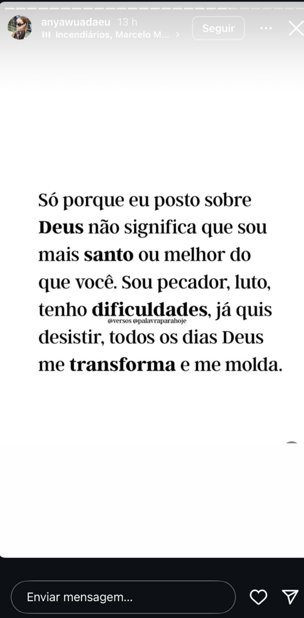 Brasil – Nesta segunda-feira (28), a influenciadora Nayara Macedo, conhecida como Any Awuada, surpreendeu os seguidores ao revelar nas redes sociais que abandonou a profissão de acompanhante de luxo e se converteu em uma igreja evangélica. A notícia viralizou, marcando um novo capítulo na vida da jovem.