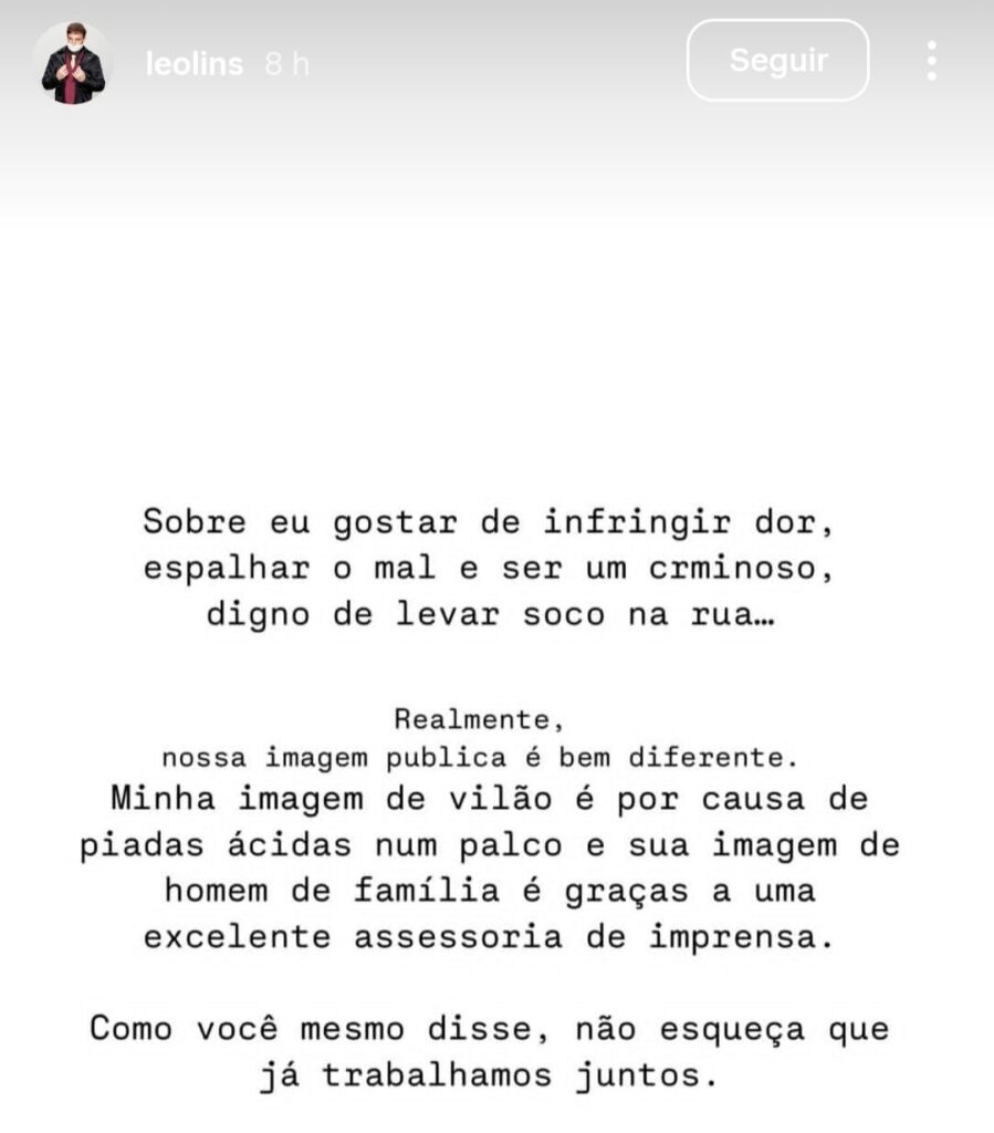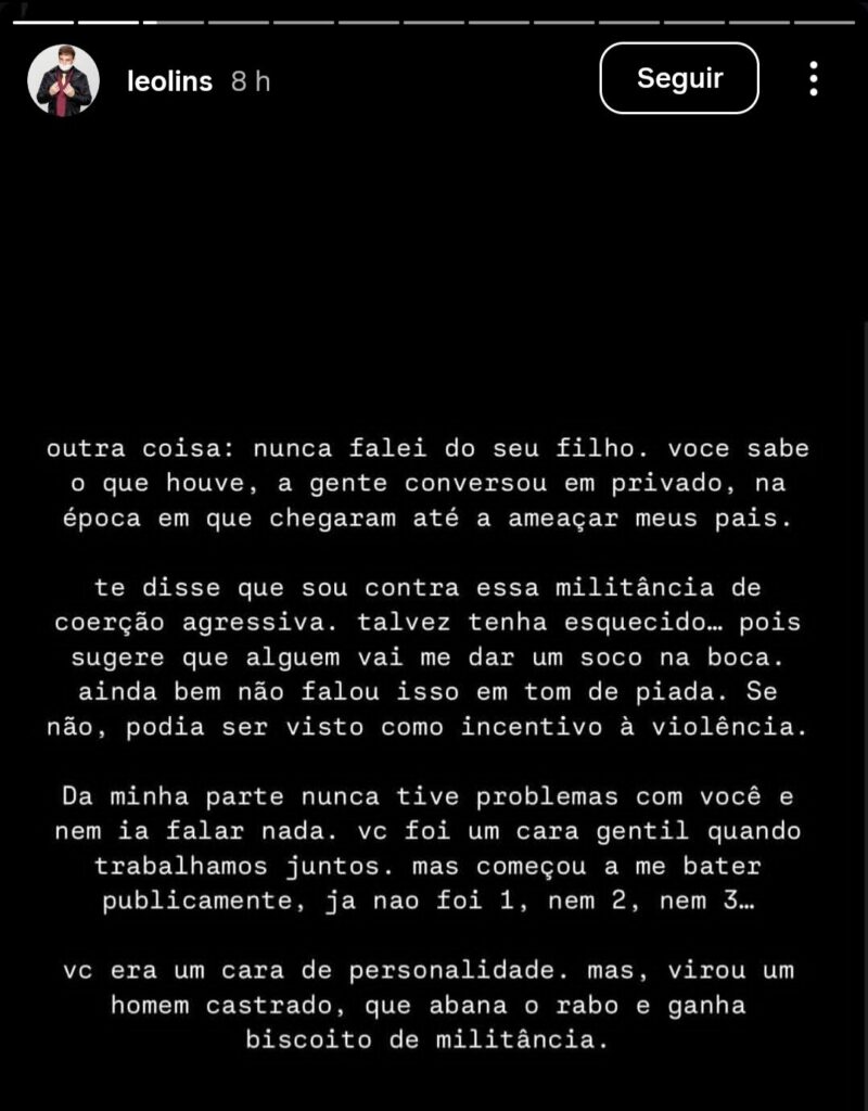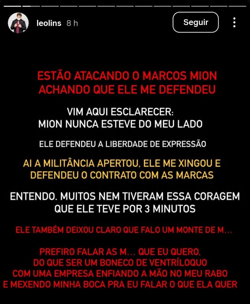 Em resposta, Léo Lins usou as redes para negar que Mion o tenha apoiado pessoalmente, destacando que o apresentador apenas defendeu a liberdade de expressão por “três minutos” antes de ceder à pressão da “militância”. “Mion nunca esteve do meu lado. Ele defendeu a liberdade de expressão, aí a militância apertou, ele me xingou e defendeu o contrato com as marcas”, escreveu Lins. Em tom crítico, ele acusou Mion de se transformar em um “boneco de ventríloquo” de grandes empresas, sugerindo que o apresentador perdeu sua autenticidade para agradar patrocinadores e grupos de pressão. “Você era um cara de personalidade. Mas virou um homem castrado, que abana o rabo e ganha biscoito de militância”, disparou.