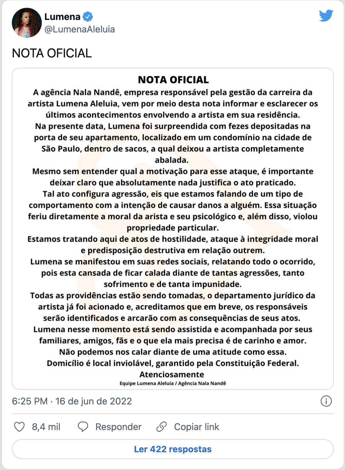 A equipe de Lumena também se manifestou ressaltando que os responsáveis serão identificados e “arcarão com as consequências de seus atos”. Por outro lado também tranquilizaram os fãs assegurando que ela está sendo acompanhada pela família e amigos.