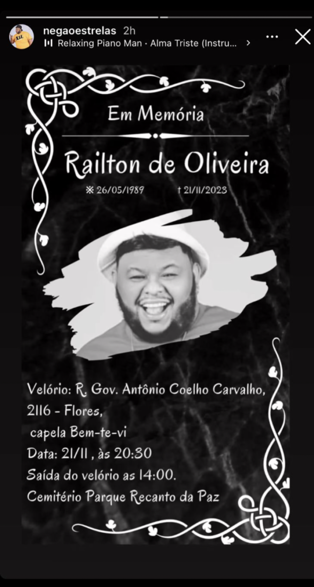 “Descanse em paz, meu irmão! Brilhe no céu”, escreveu um amigo de Railton. O velório do músico está marcado para ocorrer a partir das 20:30 hoje na funerária Recanto da Paz, Capela Bem-te-vi, localizada na rua Governador Antônio Coelho Carvalho, 2116 – bairro Flores.