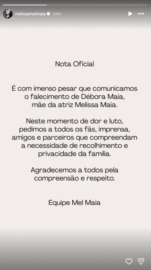 “É com imenso pesar que comunicamos o falecimento de Débora Maia, mãe da atriz Melissa Maia. Neste momento de dor e luto, pedimos a todos os fãs, imprensa, amigos e parceiros que compreendam a necessidade de recolhimento e privacidade da família. Agradecemos a todos pela compreensão e respeito”, diz o comunicado.