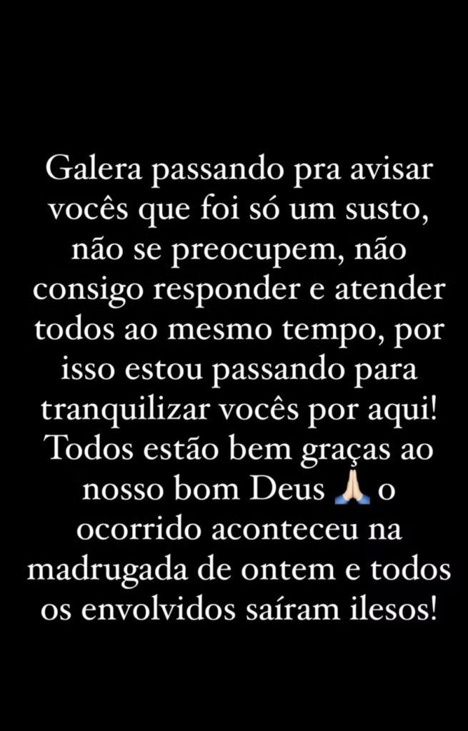 Em uma publicação nas redes sociais, João Gustavo, filho de dona Ruth, confirmou o acidente e também afirmou que todos estão bem. “Galera passando pra avisar vocês que foi só um susto, não se preocupem, não consigo responder e atender todos ao mesmo tempo, por isso estou passando para tranquilizar vocês por aqui! Todos estão bem graças ao nosso bom Deus. O ocorrido aconteceu na madrugada de ontem e todos os envolvidos saíram ilesos!”.