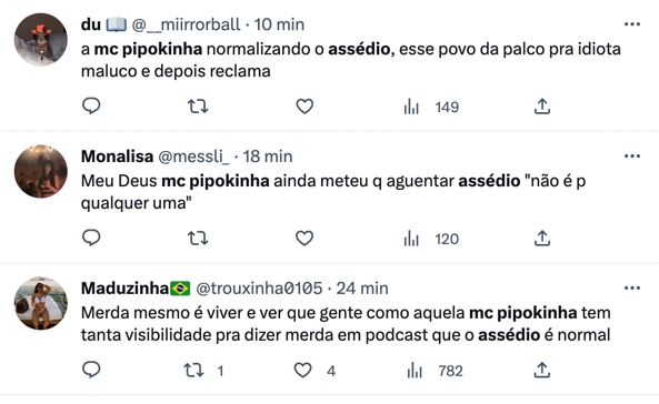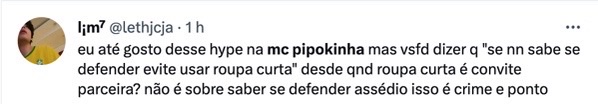 A declaração da artista foi dada em entrevista ao podcast Creators. Na ocasião, Pipokinha enfatizou que “sempre vai ter alguém querendo passar dos limites com você” e que cabe a pessoa vítima do assédio “se impor e se defender”.