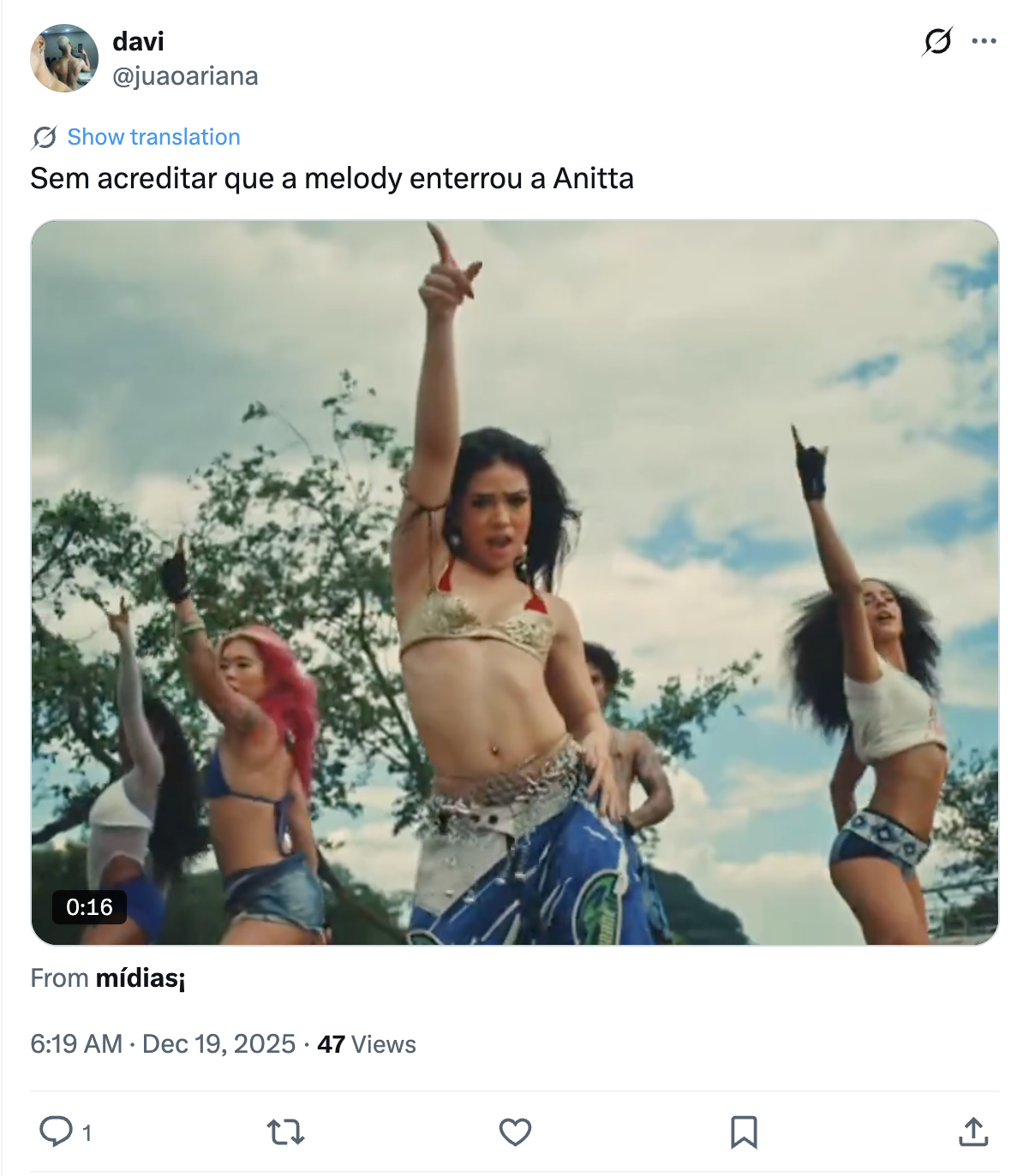 Nas redes — especialmente no X (antigo Twitter) — fãs exaltam a jovem artista de 18 anos, apontando seu desempenho como prova de que ela está pronta para assumir um posto de destaque no pop nacional. Em muitas publicações, internautas vão além dos elogios técnicos e brincam que Melody estaria “enterrando” Anitta e se consolidando como a nova rainha do pop brasileiro.