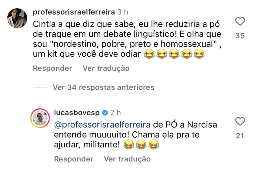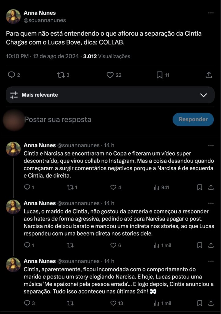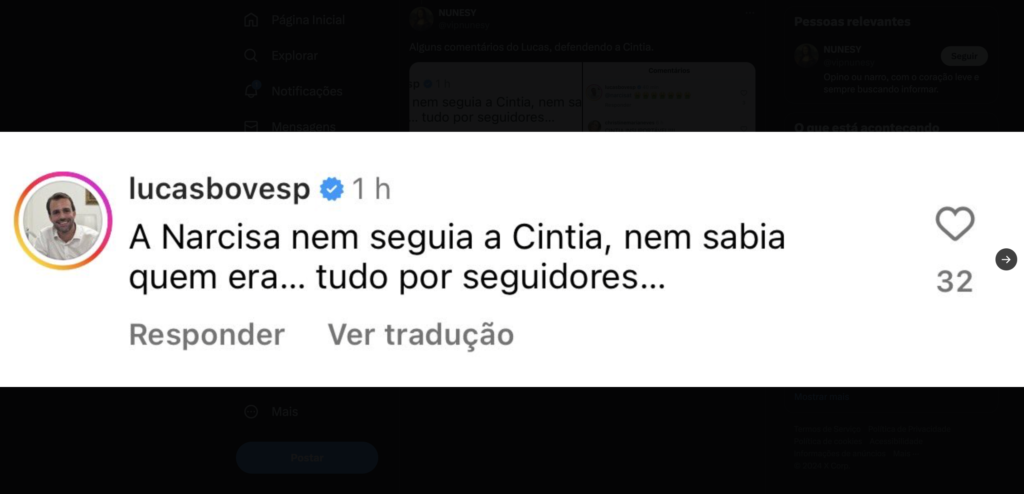 O clima esquentou quando Lucas, incomodado com os comentários negativos sobre a collab, reagiu de forma agressiva nas redes sociais, chegando a pedir que Narcisa apagasse o post. A socialite, por sua vez, respondeu com uma indireta nos stories, que foi seguida por uma resposta direta de Lucas. A situação teria deixado Cíntia desconfortável, levando-a a elogiar Narcisa publicamente, o que pode ter sido o último sinal de que o relacionamento estava chegando ao fim.