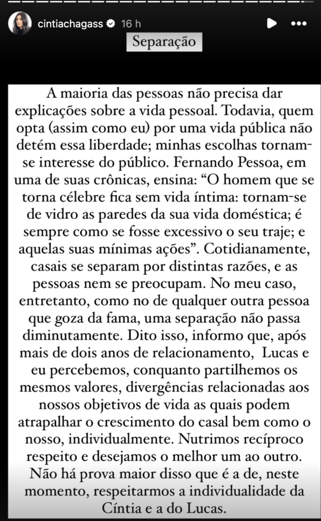 A influenciadora ainda mencionou que a decisão pelo divórcio foi baseada em divergências quanto aos objetivos de vida do casal. “Informo que, após mais de dois anos de relacionamento, Lucas e eu percebemos, conquanto partilhemos os mesmos valores, divergências relacionadas aos nossos objetivos de vida as quais podem atrapalhar o crescimento do casal, bem como o nosso, individualmente. Nutrimos recíproco respeito e desejamos o melhor um ao outro”, concluiu.