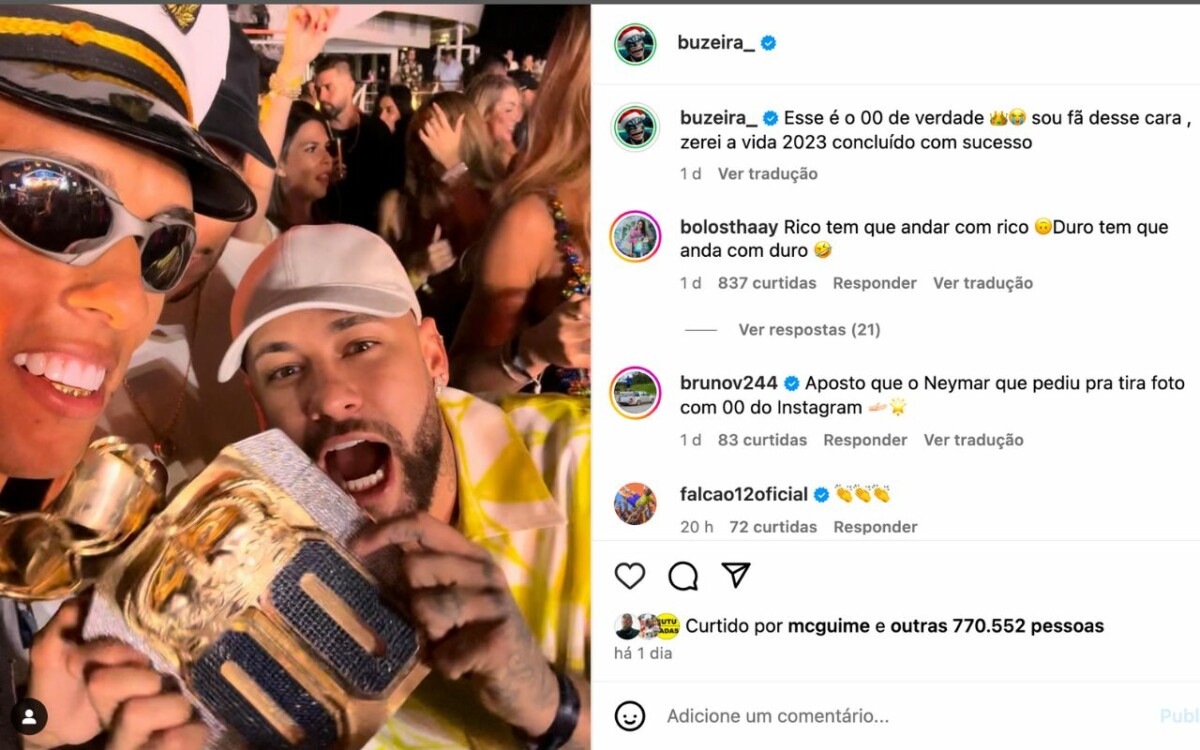 Buzeira, cujo nome real é Bruno Alexssander, publicou o momento da entrega do presente com a legenda: “Presente do 00 para o 00 chefe. Nem ele acreditou”. Neymar, visivelmente surpreso, aceitou o colar e se retirou para sua área privativa. A brincadeira de Buzeira, mencionando que agora Neymar ganharia a Copa do Mundo, não foi suficiente para amenizar as reações negativas de alguns seguidores.