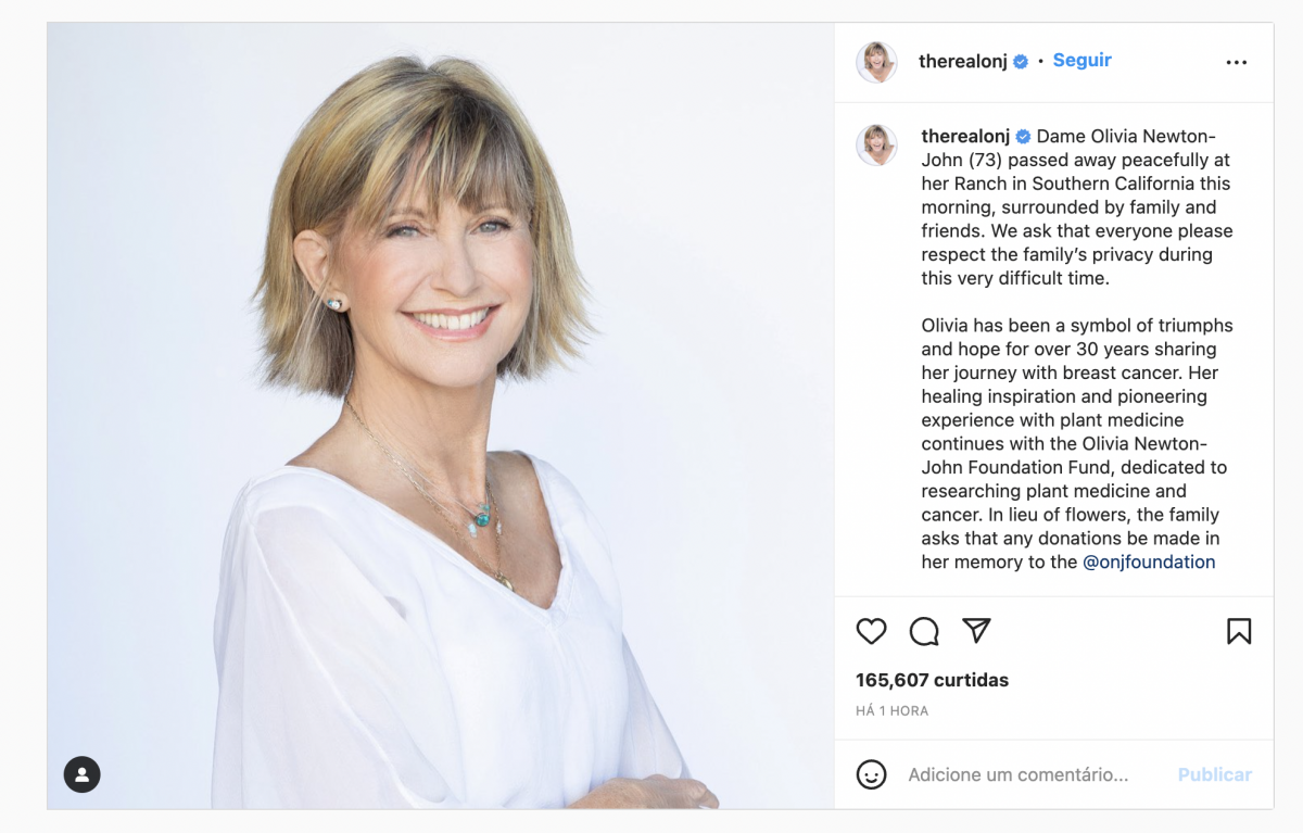 O comunicado da morte de OIivia Newton-John pode ser lido na íntegra abaixo: