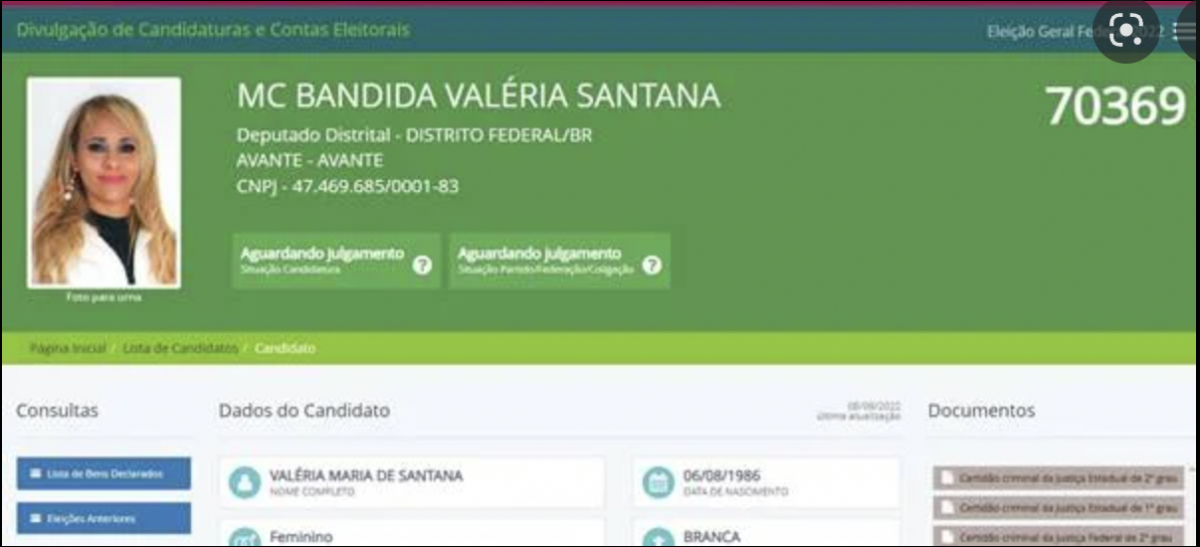 Brasil – A funkeira Valéria Maria de Santana, conhecida como MC Bandida, registrou pedido de candidatura a deputada distrital pelo Avante. É a terceira vez que MC Bandida concorre a uma vaga na Câmara Legislativa do Distrito Federal (CLDF). Na última disputa, em 2018, ela obteve 120 votos e não se elegeu.