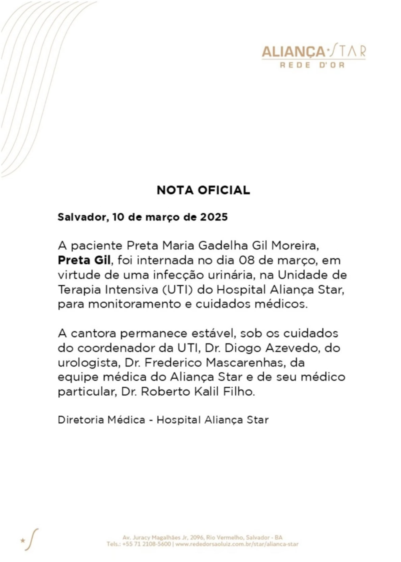 De acordo com a nota oficial, Preta Maria Gadelha Gil Moreira, conhecida artisticamente como Preta Gil, foi admitida na Unidade de Terapia Intensiva (UTI) do Hospital Aliança Star para um acompanhamento mais detalhado. “A paciente foi internada no dia 8 de março em virtude de uma infecção urinária, sendo encaminhada à UTI para monitoramento e cuidados médicos”, informou o comunicado.
