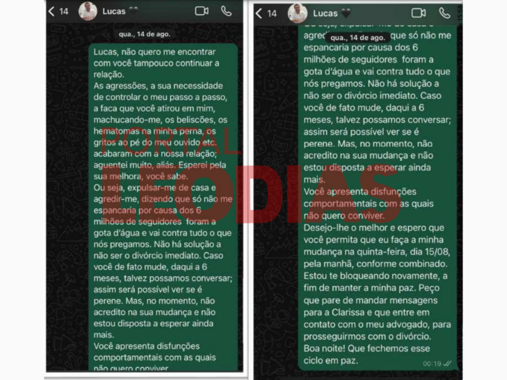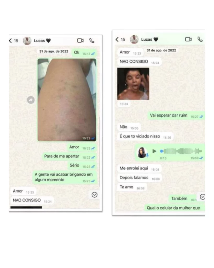 As conversas entre o casal, que se estendem desde 2022, mostram a constante súplica de Cíntia para que Lucas parasse de machucá-la. Em uma mensagem de 13 de março de 2023, ela, mais uma vez, compartilha uma foto de sua perna machucada e suplica: “Por favor, amor. Pare. Tô pedindo. Dá muita raiva de olhar.”