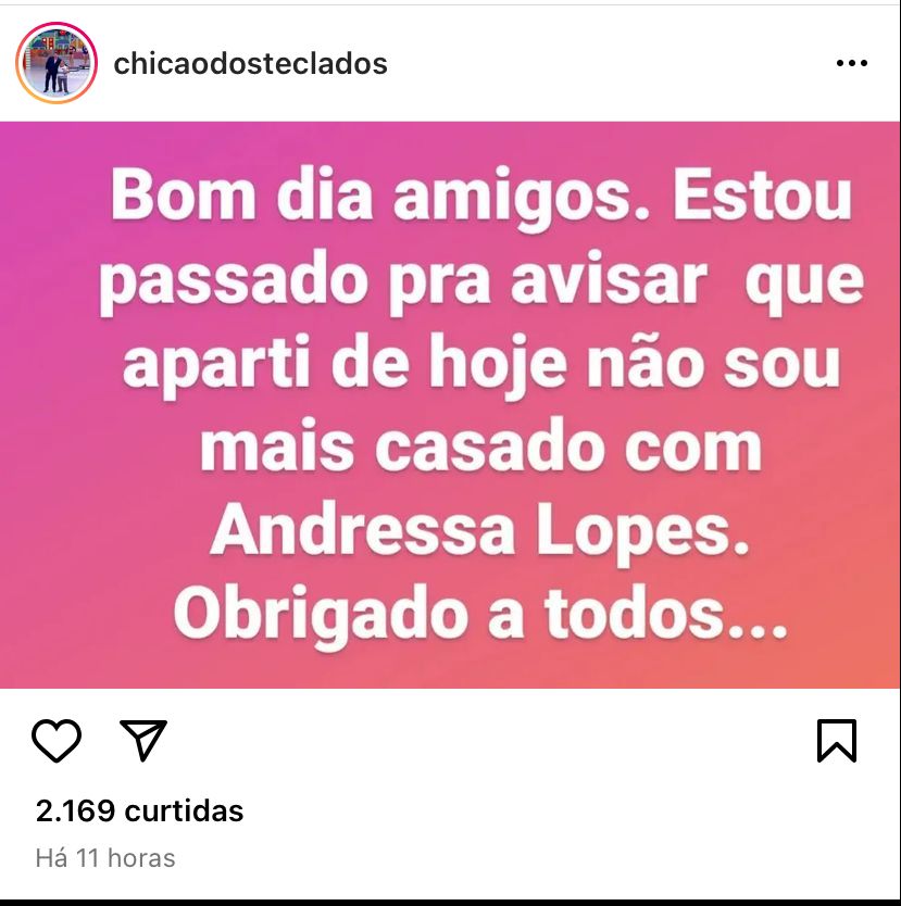 Brasil – Em janeiro de 2022 Andressa Lopes e Chicão dos Teclados decidiram pôr um fim no relacionamento de nove anos, após a descoberta de uma traição. A primeira informação que chegou foi de que Chicão estava traindo Andressa e que após ela descobrir, e tentar perdoá-lo, ele a expulsou de casa para ficar com outra.
