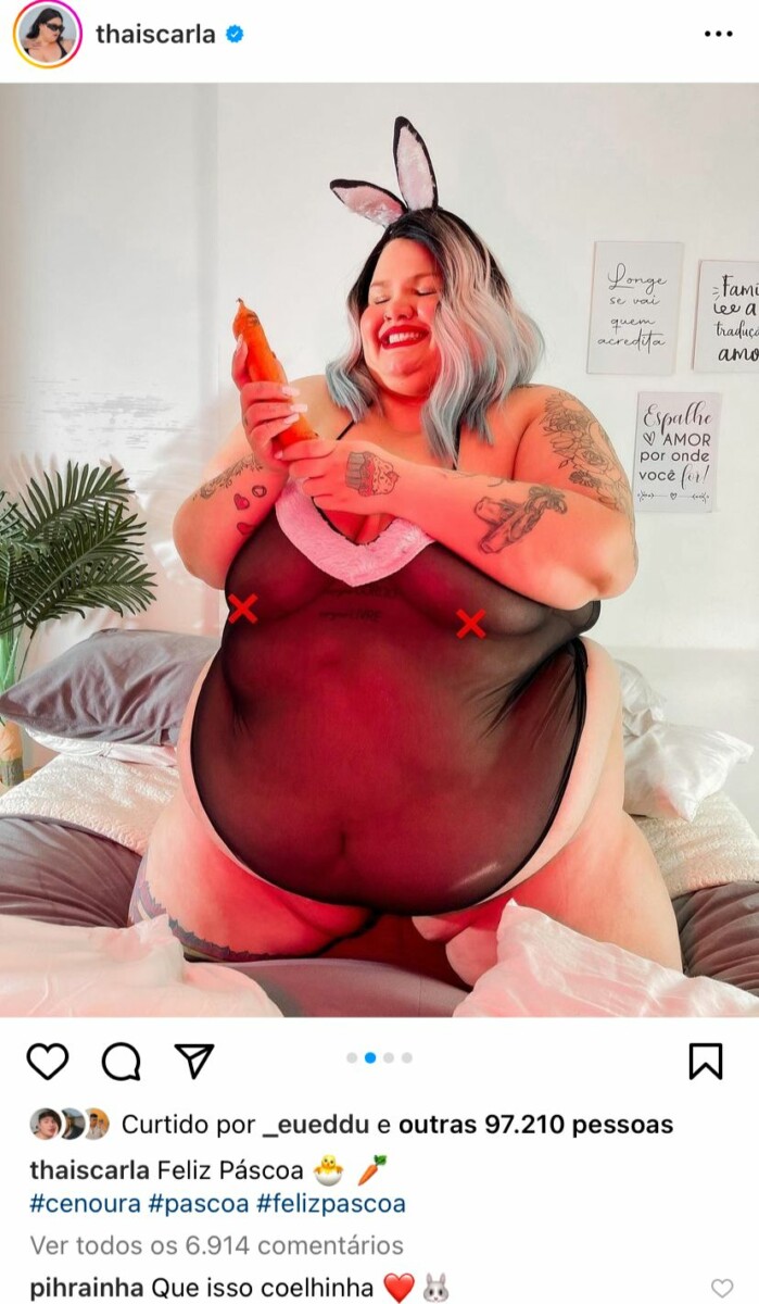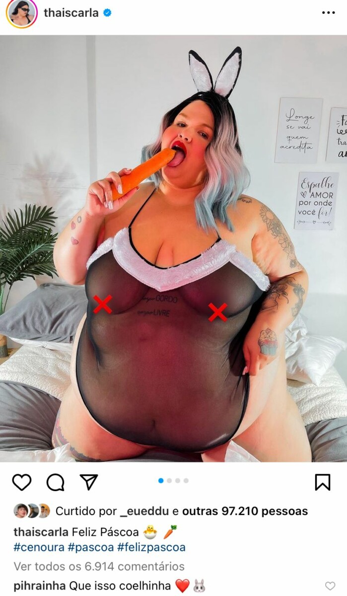 Com um tipo de body transparente, Thais ainda colocou duas orelhinhas de coelho e comeu uma grande cenoura.