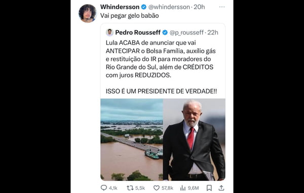 Em seu perfil no X, antigo Twitter, Whindersson comentou uma publicação do economista Pedro Rousseff, com informações sobre a antecipação do Bolsa Família, do Auxílio Gás e da restituição do Imposto de Renda, anunciadas por Lula para o povo do RS. Na legenda, escreveu: “Vai pegar gelo, babão”.