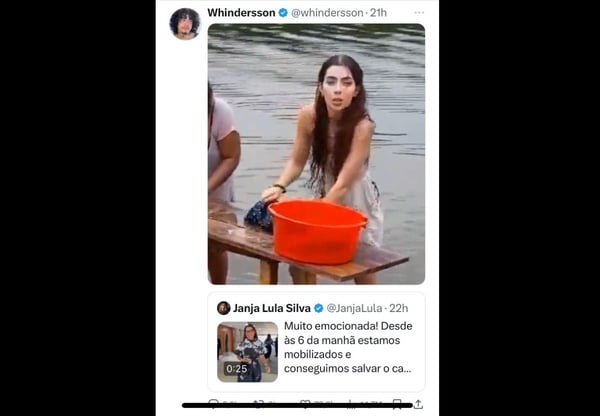 Em sua postagem, Whindersson publicou, acima do vídeo, uma foto da atriz Jade Picon lavando roupas na margem de um rio, numa cena da novela Travessia, da Rede Globo. A ironia irritou militantes da esquerda, que saíram em defesa da primeira-dama.