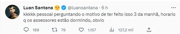 Em uma outra publicação, o autor da “brincadeira” contou porque escolheu o horário da madrugada para hackear a rede social. “Pessoal perguntando o motivo de eu ter feito isso às 3 da manhã. Horário que os assessores estão dormindo, óbvio”, completou ele. Duas horas depois de ter acesso à conta de Luan Santana, a pessoa se despediu.