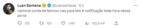 “Cantor e Masturbador”, diz a mensagem destacada do perfil de Luan Santana. Durante a madrugada, o hacker se pronunciou e pediu seguidores, ele explicou que costuma fazer isso e ainda reclamou das notificações. “Namoral, conta de famoso não para. É notificação toda hora nessa porra”, disse.