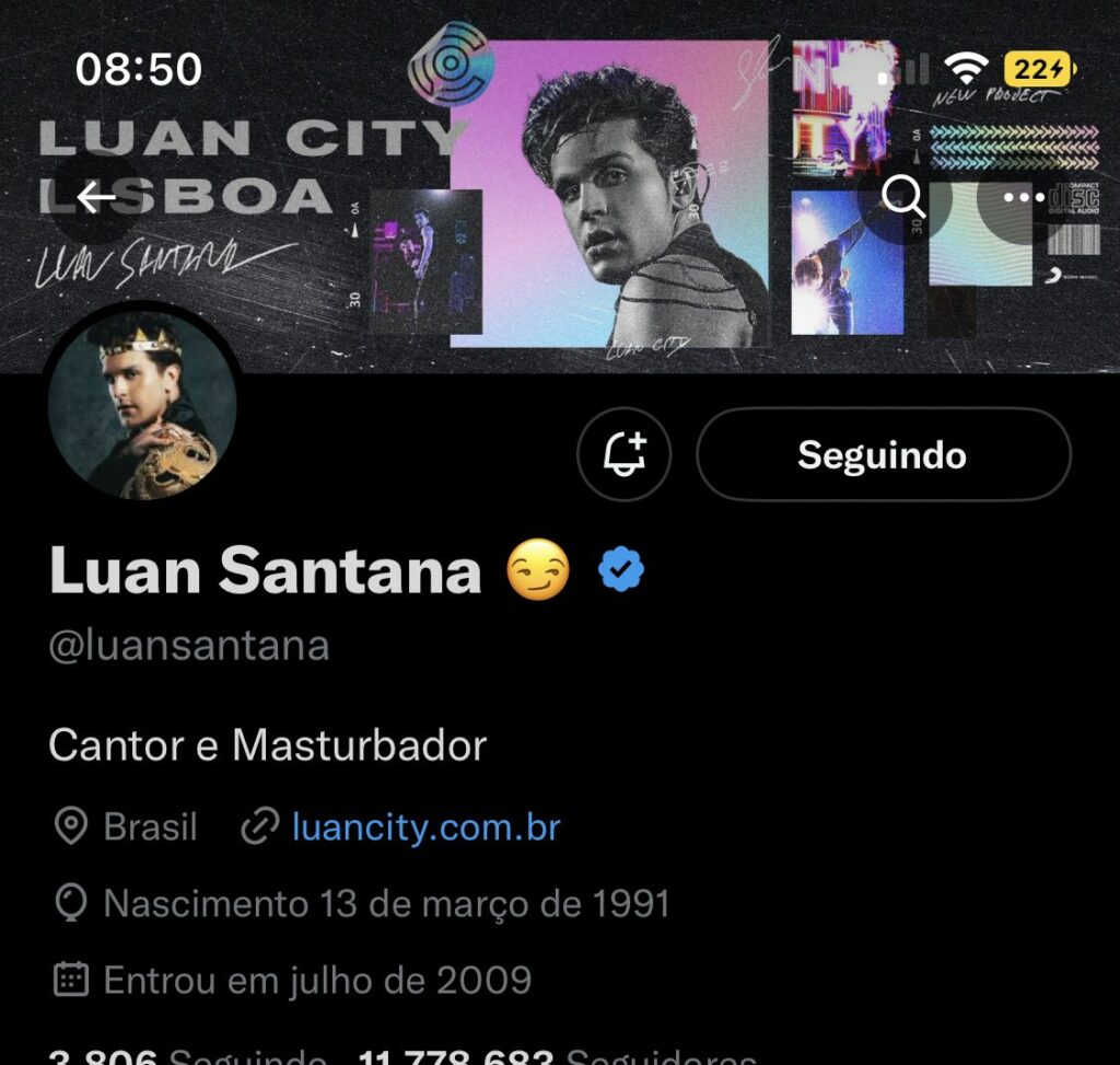 Brasil – Luan Santana está passando por um verdadeiro perrengue com suas redes sociais. Isso porque, durante a madruga, o cantor teve o Twitter hackeado e foi zombado pelo autor da “pegadinha”. Além de alterar a bio do artista, a pessoa ainda publicou diversas imagens do ator pornô Kid Bengala.