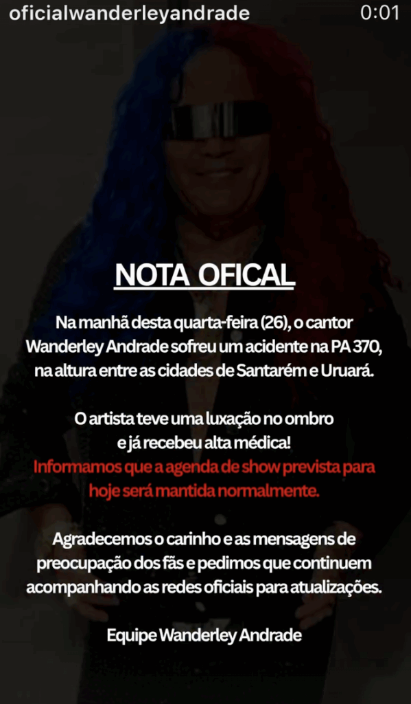No entanto, uma nota oficial divulgada pela equipe do cantor trouxe alívio aos admiradores. De acordo com o comunicado, Wanderley Andrade sofreu apenas uma luxação no ombro, recebeu atendimento médico e já teve alta. A nota reforça que o estado de saúde do artista é estável e que ele está fora de perigo. A equipe também confirmou que a agenda de shows prevista para hoje será mantida normalmente, demonstrando a resiliência do cantor em continuar com seus compromissos profissionais.