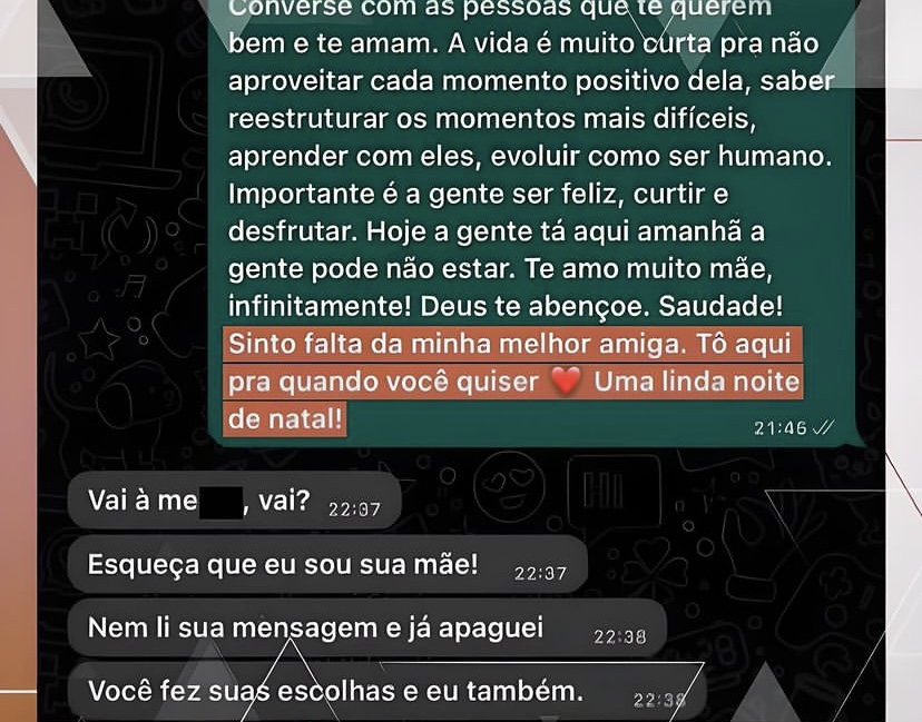 Conforme a imagem, a resposta da mãe foi a seguinte: “Vai à merda, vai? Esqueça que sou sua mãe. Nem li sua mensagem e já apaguei. Você fez suas escolhas e eu também.”