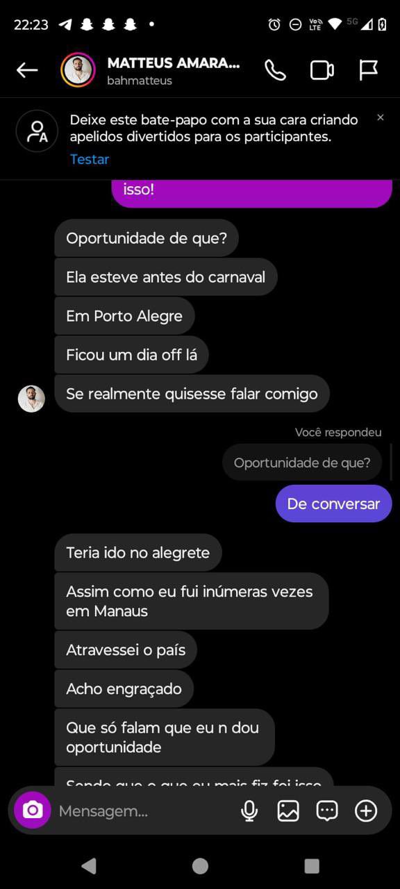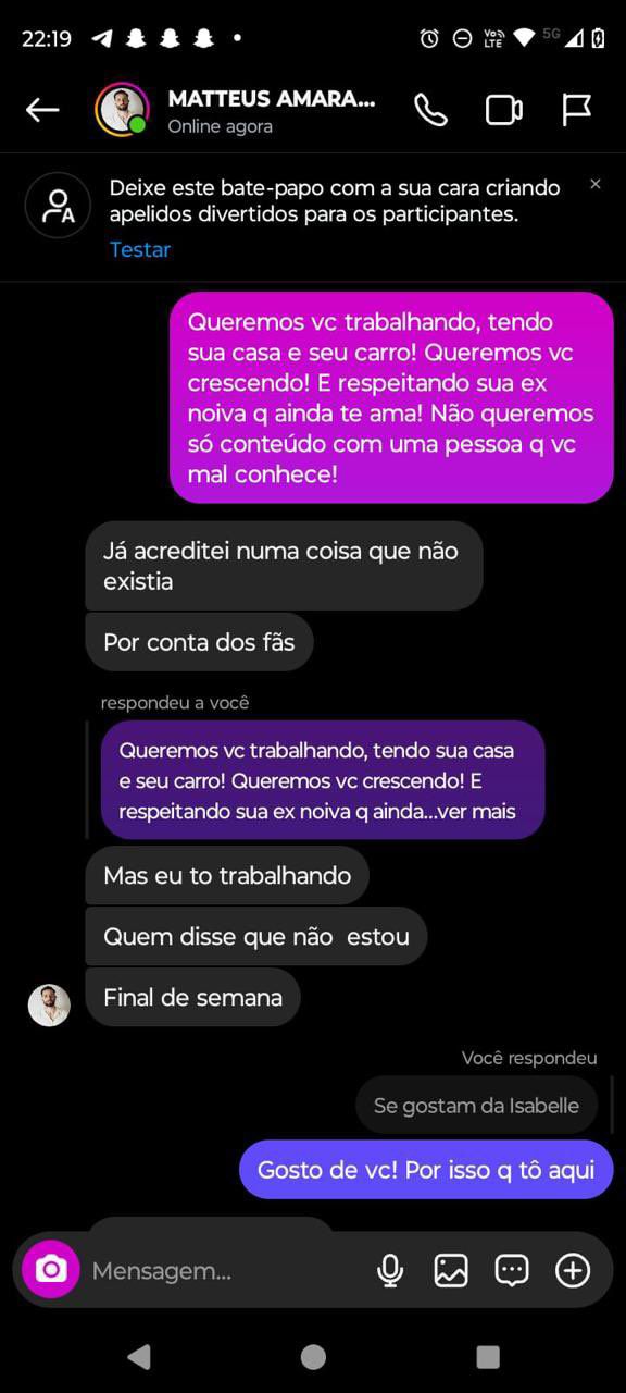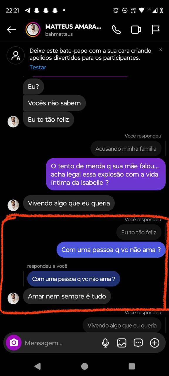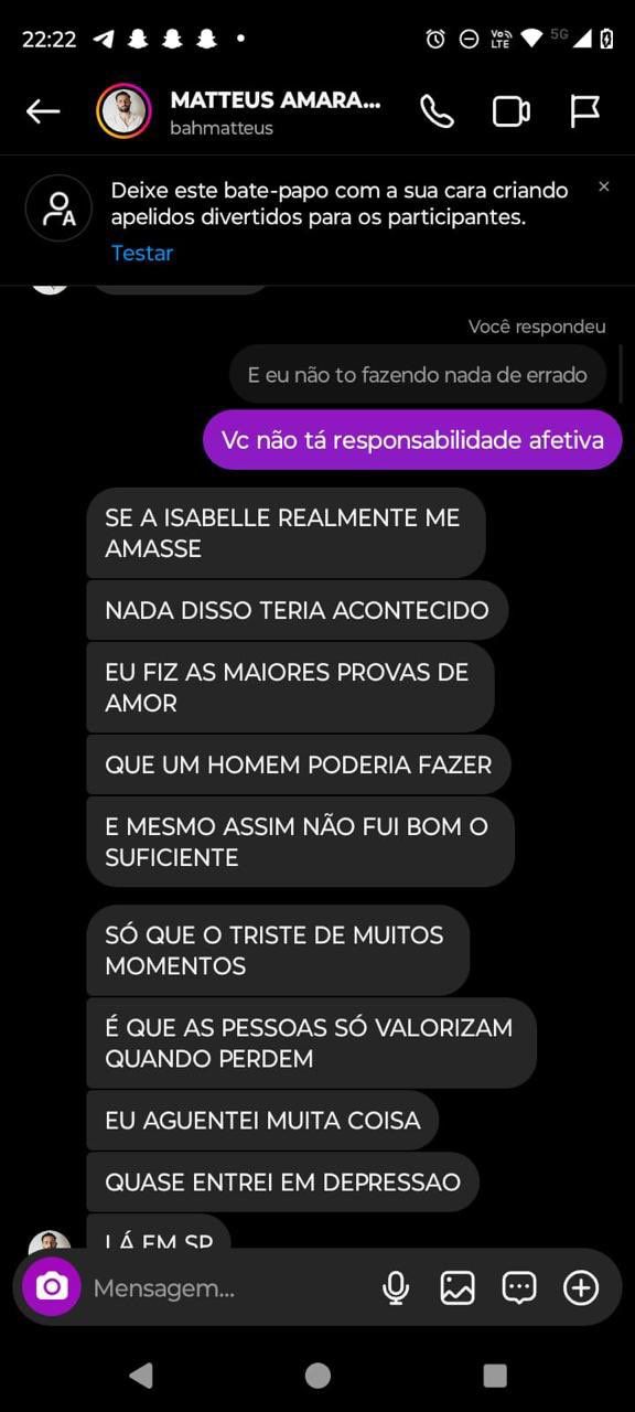 Em outro trecho da conversa, Matteus questiona se Isabelle realmente o amava e diz que fez de tudo pelo relacionamento, e que quase entrou em depressão. Agora, ele diz estar feliz em seu novo relacionamento com Anna Julia Ferreira.
